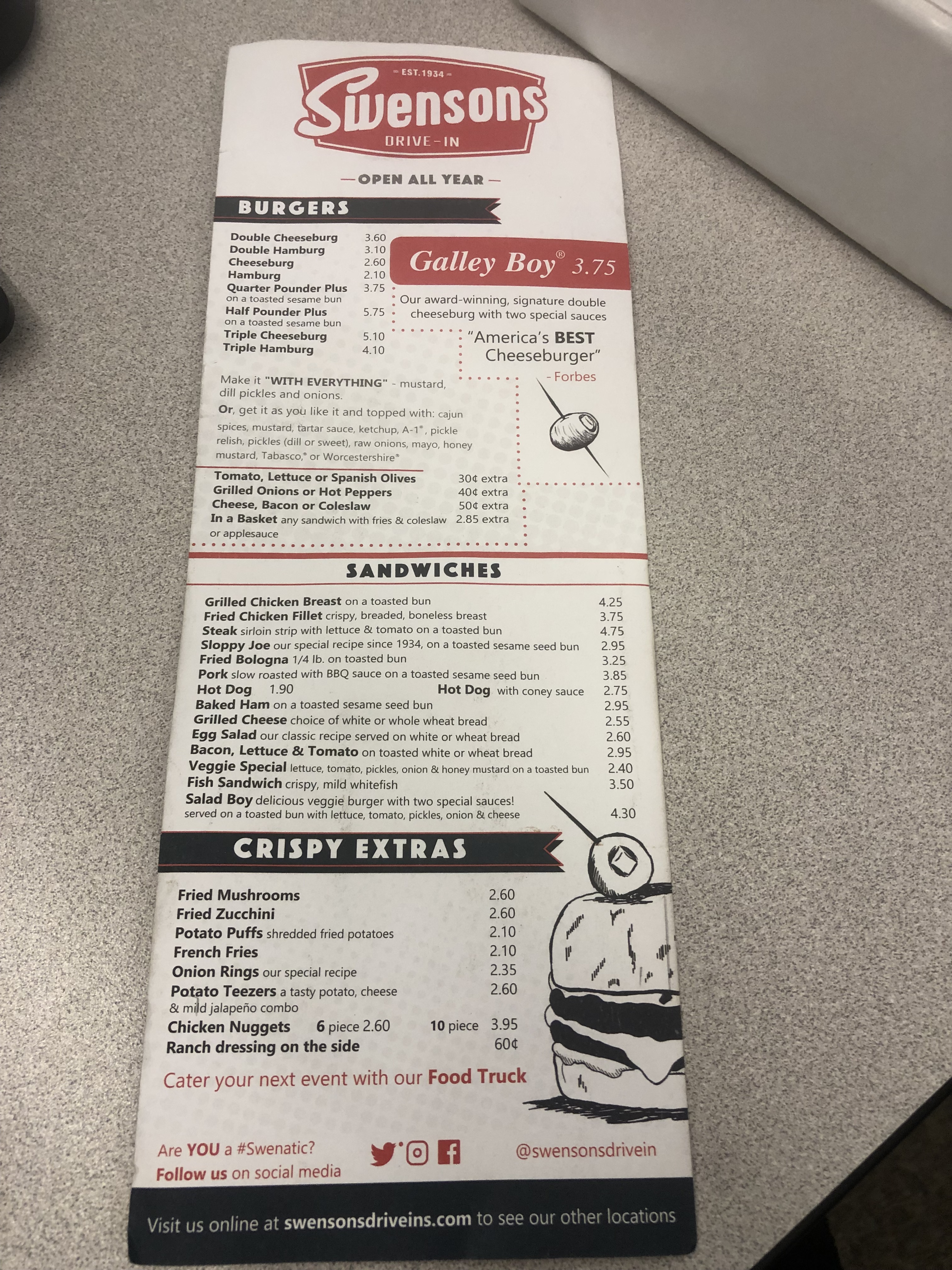 Swenson’s is most popular for their burgers, especially their “Galley Boy” burger. They also have other options if you are not a fan of burgers, like grilled cheese, chicken tenders, and fish sandwich. Even if you want a quick snack they have several options. For example, fries, onion rings, fried pickles, and potato teasers. After eating all this greasy food, many top it off with a soda drink, or their milkshakes.
